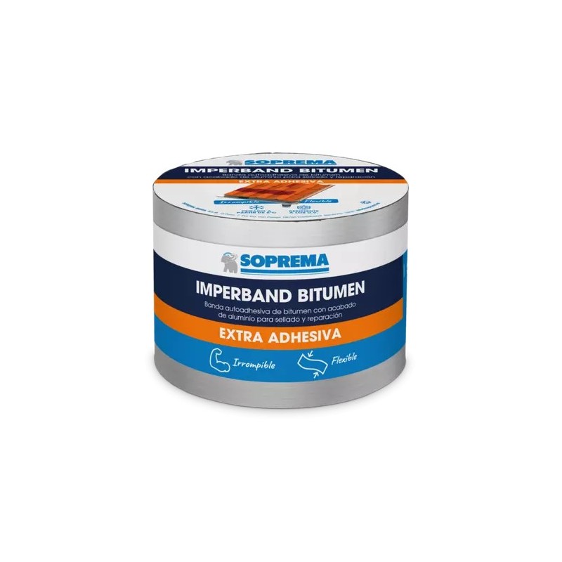 Imperband Bitumen es una banda bituminosa impermeable autoadhesiva con lámina metálica de aluminio natural reforzada con poliéster. Su compuesto bituminoso adhesivo está protegido por una película de silicona.